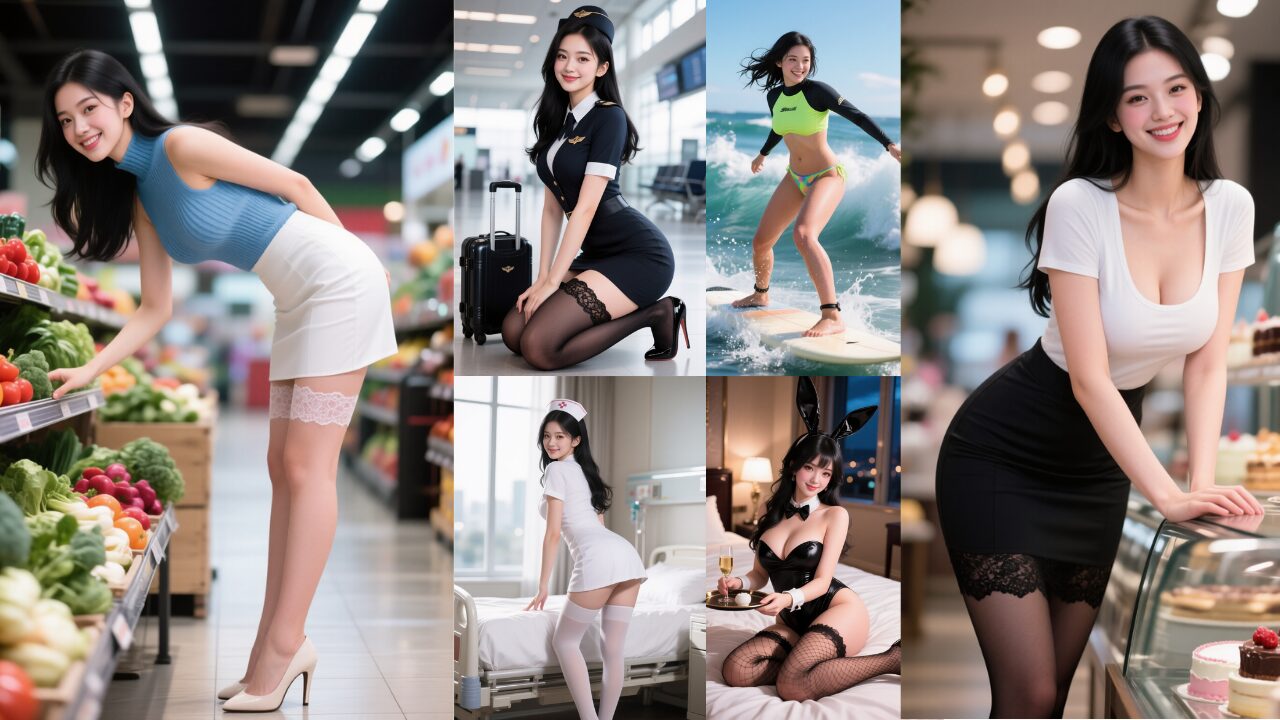(1)顔系のプロンプトを固定して、衣装・ポーズ・背景を色々と変えてみました。顔はある程度固定できそうです。